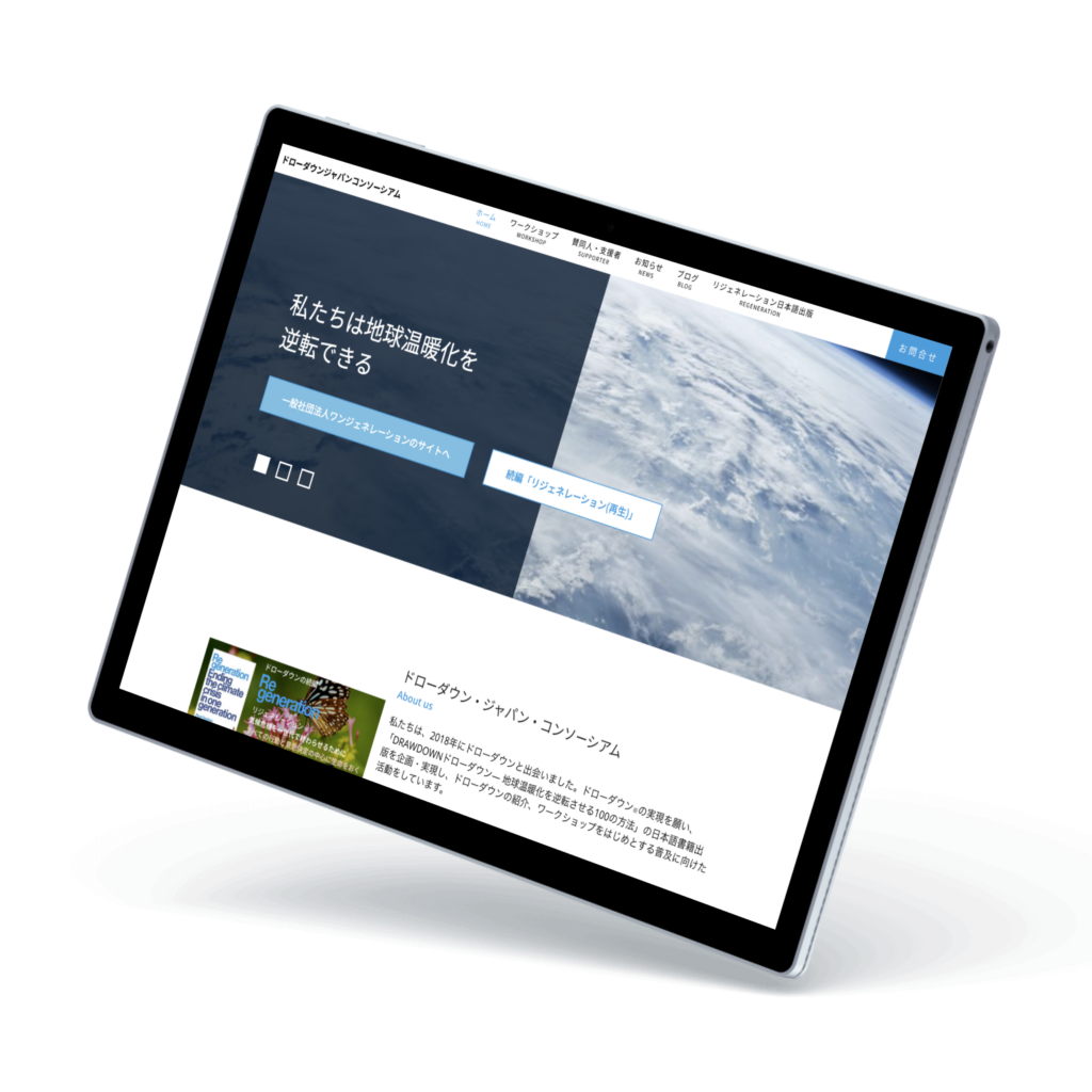 ワンジェネーションの始まりとも言えるプロジェクトが「ドローダウン・ジャパン・コンソーシアム」です。ニューヨークタイムズ のベストセラー書籍・「DRAWDOWNドローダウン― 地球温暖化を逆転させる100の方法」に感銘を受けたスタッフたちによって、本書の日本語版出版に向けたプロジェクトが発端となり、日本におけるドローダウンの普及活動やコミュニティ運営、事例紹介や専門家へのインタビューなど、ドローダウンのポータルサイトとして情報を発信しています。