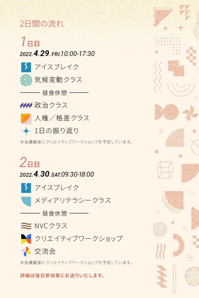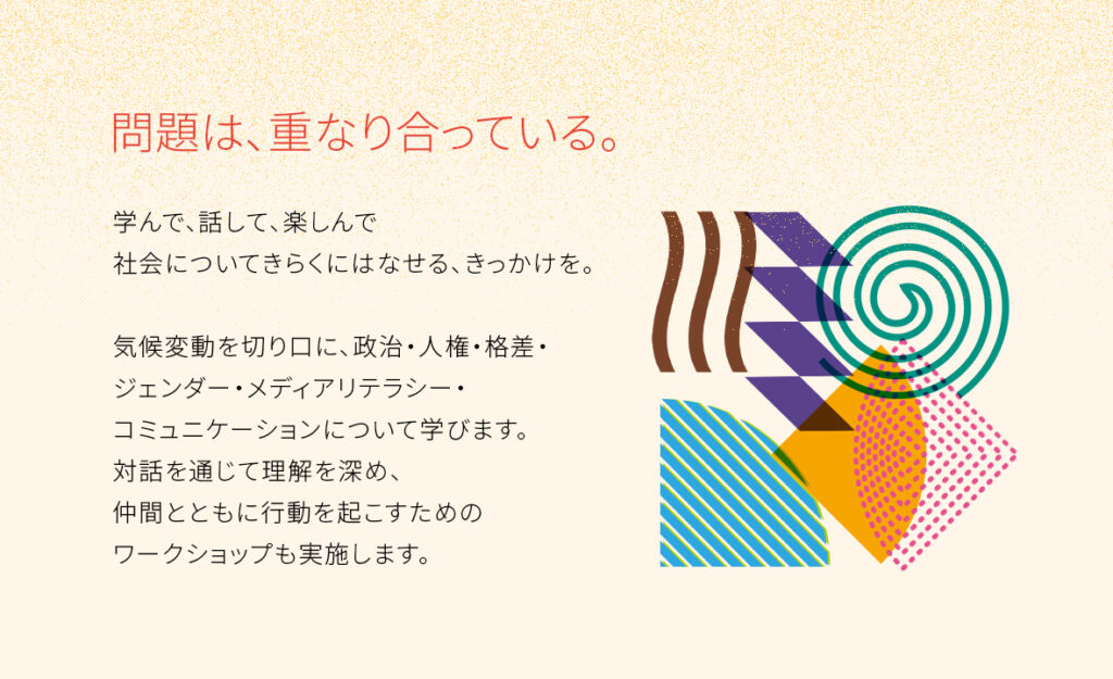 気候変動を切り口に政治・人権・格差・ジェンダー・メディアリテラシー・コミュニケーションについて学び、行動を起こすためのワークショップも実施する2日間の15~24歳の学生向けイベントが開催されます。